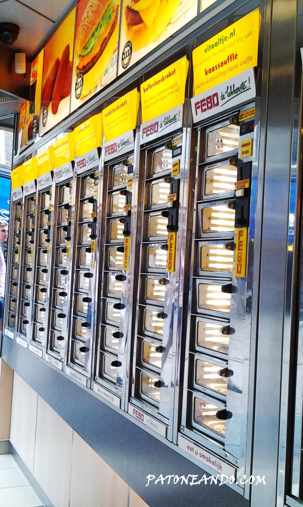Segunda parada, FEBO, es el restaurante de comida típica de Holanda que se caracteriza por expender la comida en máquinas. Monedas, botón y recibo mi kroket (croquetas de pollo) y mi frikandel (es un tipo de salchicha ahumada).